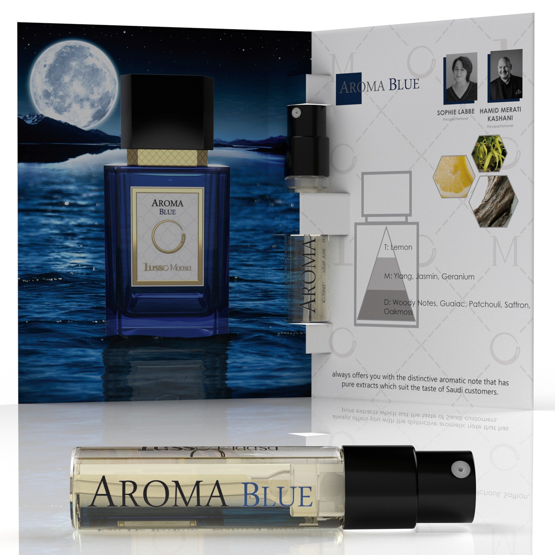 يبحر العطار إلى أعماق الرجل بحثاً عن مكنونات جميلة يتمنى الرجل أن يظهرها لمن حوله معبراً عن جمال روحه الداخلية بأزكى الفواتح العطرية من المكونات ( الليمون و اليلنج و الجيرانيوم و الغوياك ) وتم تتويج ذلك الجوهر بلون البحر الأزرق الذي يضم الكثير من معاني الرجولة في زجاجة عطر حيث لا يفقد جاذبيته بتركيبة ذات طابع نقي ومكثف .. عطر أروما بلو من ماركة لوسو ماسا