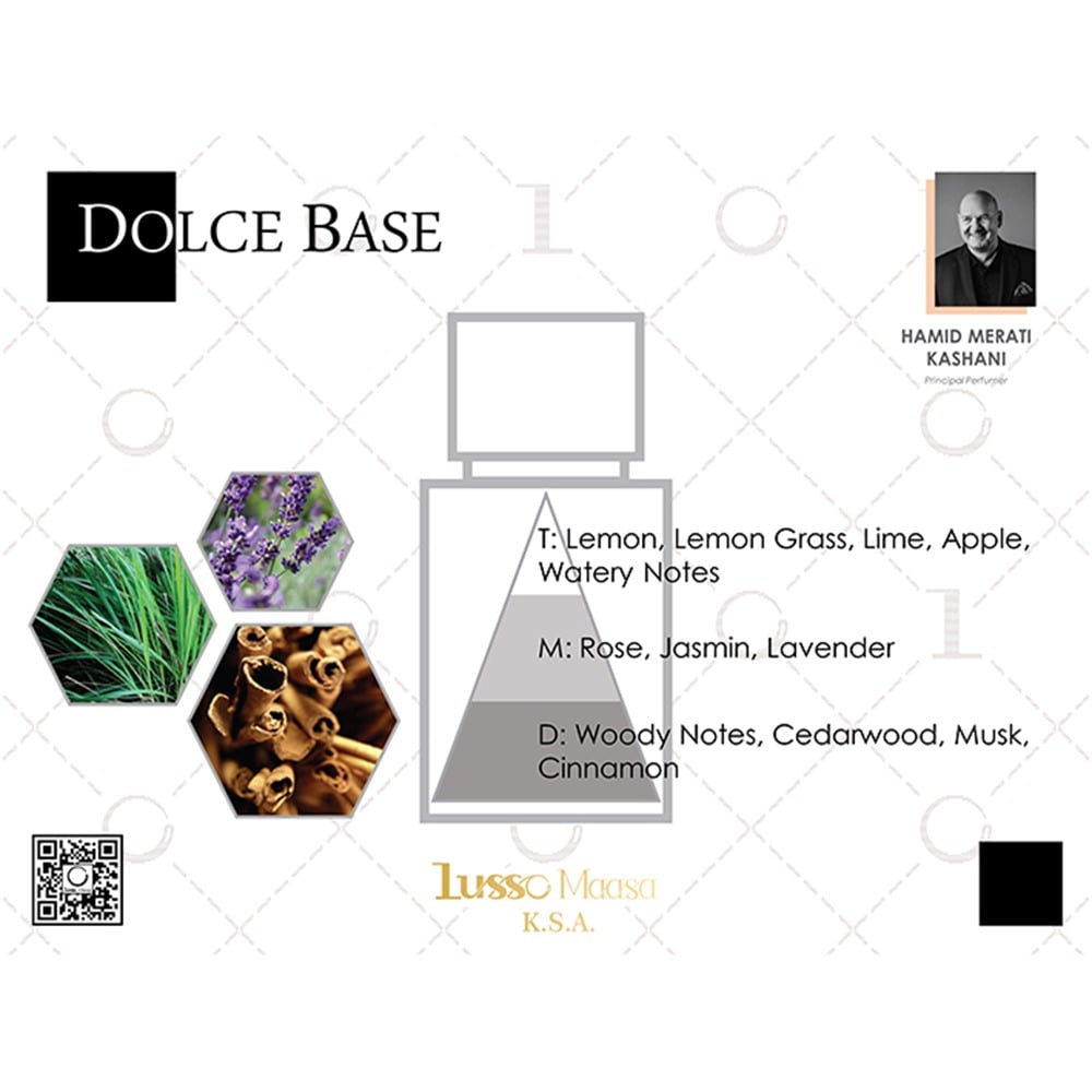 عطر فرش ليموني يدخل الحيوية للنفس في الصباح ووقت الظهيرة , ابدأ يومك العملي بعطر DOLCE BASE ثابت ومنعش ويشعرك بالسعادة الغامرة وتحسن بالمزاج , وإذا تم رشه مساءاً فسيشعرك بجمال الصباح وعطائه