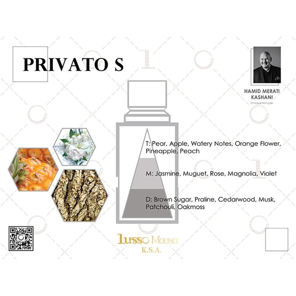A men's and women's perfume par excellence. PRIVATO S perfume presents a collision between materials to create a magnetic state between you and the fragrance for a lasting period of stability and focus in order to be used at all times to brighten the nights and extend its shadow during the day